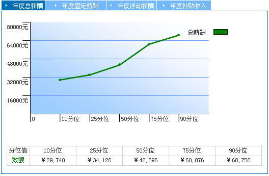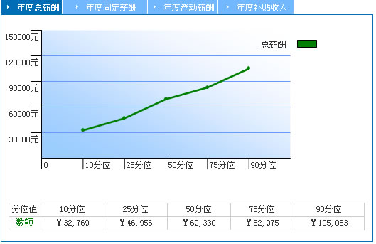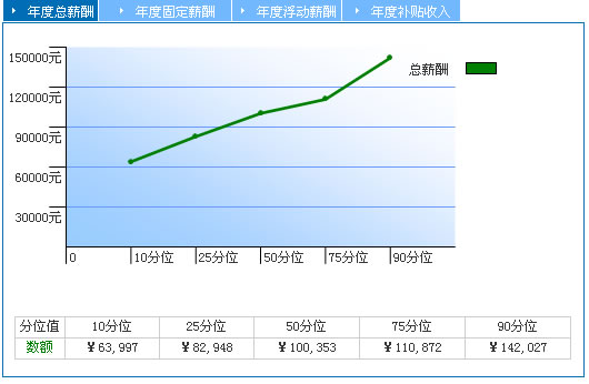 50分位 也稱為中位數,表示有50%的數據小于此數值,反映市場的中等水平。相比于平均值,中位數不易受到極端值的影響,更加便于您了解市場的薪酬水平。