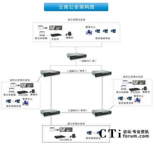 云南省公安廳視頻系統(tǒng)全網(wǎng)建設(shè)結(jié)構(gòu)分為三級:共有146臺MCU,使用的是省廳—地州、市—縣級的3級樹狀級聯(lián)模式組網(wǎng)。整個項(xiàng)目遍布整個云南省公安系統(tǒng),項(xiàng)目實(shí)施至16個地州市、129個縣以及各縣轄區(qū)所有的派出所、戒毒所、看守所。會場數(shù)目前約有2200個,還在陸續(xù)增加中。同時支持調(diào)用縣級公安局指揮中心監(jiān)控視頻編碼器的實(shí)時監(jiān)控圖像。