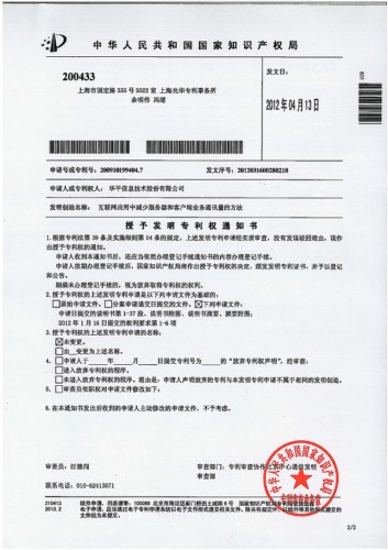 圖為: 互聯(lián)網(wǎng)應(yīng)用中減少服務(wù)器和客戶端業(yè)務(wù)通訊量的方法專(zhuān)利授權(quán)書(shū)
