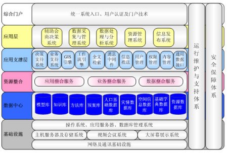 中科軟依據(jù)據(jù)北京市的總體框架,結(jié)合中科軟多年應(yīng)急系統(tǒng)的經(jīng)驗,進一步細化應(yīng)用框架到可實施框架,從下向上依次是基礎(chǔ)設(shè)施層、數(shù)據(jù)中心層、資源整合層、應(yīng)用支撐層、應(yīng)用層、綜合門戶,并有安全保障體系和運行維護與支持體系保障系統(tǒng)的正常運行。如下圖所示: