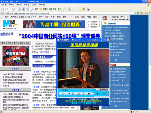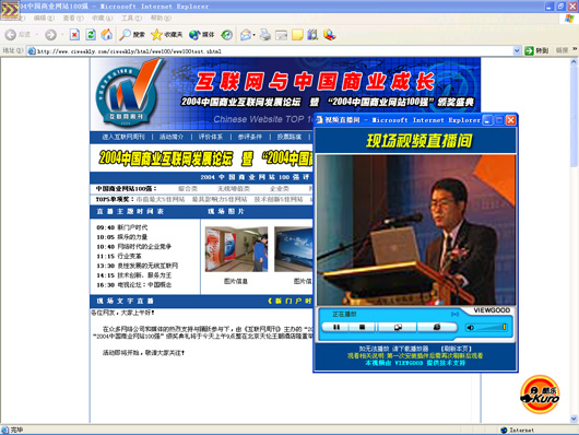 作為此次活動全程流媒體直播技術(shù)提供商VIEWGOOD(www.viewgood.com)商務(wù)主管在活動現(xiàn)場說:“中國大陸的上網(wǎng)用戶總?cè)藬?shù)即將突破1億,中外商業(yè)網(wǎng)站的資本運作空前活躍,3G、IPv6等新技術(shù)將催生互聯(lián)網(wǎng)的新一輪變革,網(wǎng)絡(luò)媒體正在從“第四媒體”快速走向“第一媒體”,致力為中國互聯(lián)網(wǎng)媒體服務(wù)的VIEWGOOD和所有的網(wǎng)站一樣,既面臨著激烈的挑戰(zhàn),更面臨著難得的發(fā)展機(jī)遇。無論是成長最快的網(wǎng)站、最具潛力的網(wǎng)站,還是創(chuàng)新最佳的網(wǎng)站,都是VIEWGOOD的合作伙伴。我們將以國際最先進(jìn)的流媒體技術(shù)服務(wù)于中國互聯(lián)網(wǎng)。”