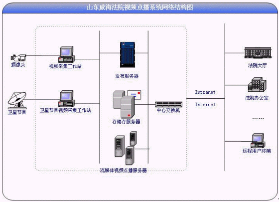 威海中級人民法院VOD應(yīng)用建設(shè)包括:用戶認(rèn)證系統(tǒng)、遠(yuǎn)程上傳系統(tǒng)、內(nèi)容分發(fā)系統(tǒng)、內(nèi)容播放系統(tǒng)(流媒體)、網(wǎng)站內(nèi)容系統(tǒng)等部分。