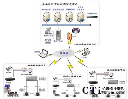 流媒體平臺采用分布式架構(gòu)部署,分為web服務(wù)器,數(shù)據(jù)庫服務(wù)器、直播服務(wù)器和流服務(wù)器,如有必要可在信息中心架設(shè)采集工作站搭建網(wǎng)絡(luò)電視或?qū)崨r直播應(yīng)用,在各個(gè)學(xué)校已經(jīng)部署錄播系統(tǒng)或直播系統(tǒng)的教室配置流媒體功能組件,這樣錄播實(shí)況可以實(shí)時(shí)傳送到流媒體平臺管理中心的全局直播服務(wù)器上,同時(shí)錄播的學(xué)校本色課件也可以上傳存儲(chǔ)到金山區(qū)教育局信息中心的流存儲(chǔ)服務(wù)器上,方便今后的檢索、點(diǎn)播、評估等各種應(yīng)用。