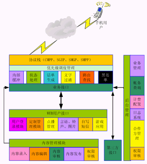 該平臺可以廣泛地應(yīng)用于SP運營系統(tǒng)和多種行業(yè)的短信息應(yīng)用。