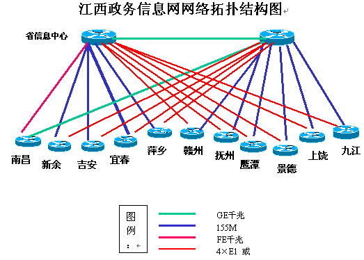 江西省于2002年8月開始實(shí)施省政務(wù)信息網(wǎng)縱向網(wǎng)省市聯(lián)網(wǎng)工程,于2002年12月底實(shí)施完畢。目前,在南昌地區(qū)已建成省級(jí)政務(wù)核心網(wǎng)及政務(wù)專網(wǎng),省委、省政府、省人大、省政協(xié)及一百多個(gè)省直部門,已通過(guò)光纜實(shí)現(xiàn)了橫向網(wǎng)絡(luò)互聯(lián)。