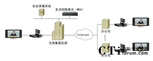 科達(dá)視頻會議解決方案就部署而言非常簡單:為海集團(tuán)深圳總部的機(jī)房架設(shè)一臺多點(diǎn)控制單元(MCU),總部會議室、各分公司的會議室則各部署一套視頻會議終端?偛繋挒10/100M,各地分公司均通過普通ADSL接入。系統(tǒng)拓?fù)鋱D如下: