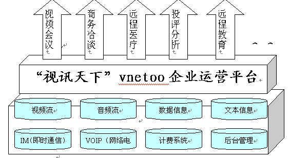 VNETOO視訊運(yùn)營(yíng)平臺(tái)具有強(qiáng)大的數(shù)據(jù)功能和優(yōu)質(zhì)的音視頻效果,是集"視頻+語(yǔ)音+數(shù)據(jù)+IM(即時(shí)通信)+VOIP(網(wǎng)絡(luò)電話)+計(jì)費(fèi)+后臺(tái)管理"的基于IP網(wǎng)絡(luò)世界一流視訊服務(wù)提供平臺(tái),它革命性地開創(chuàng)了視訊運(yùn)營(yíng)領(lǐng)域的全新模式。(見圖表一:"視訊天下"vnetoo運(yùn)營(yíng)平臺(tái)結(jié)構(gòu))。