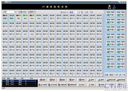 在此界面中實現(xiàn)了配置管理功能和呼叫相關(guān)功能。配置管理分為:設(shè)置、修改和刪除分組,設(shè)置用戶,設(shè)置中繼,翻頁等功能;呼叫相關(guān)功能:強接、強拆、強插、監(jiān)聽、轉(zhuǎn)接、組呼、設(shè)定等級、設(shè)定權(quán)限、設(shè)定夜服、會議相關(guān)等功能。另外,可以在本軟調(diào)度系統(tǒng)中檢索瀏覽相關(guān)通話記錄,并可對錄音進(jìn)行回放。