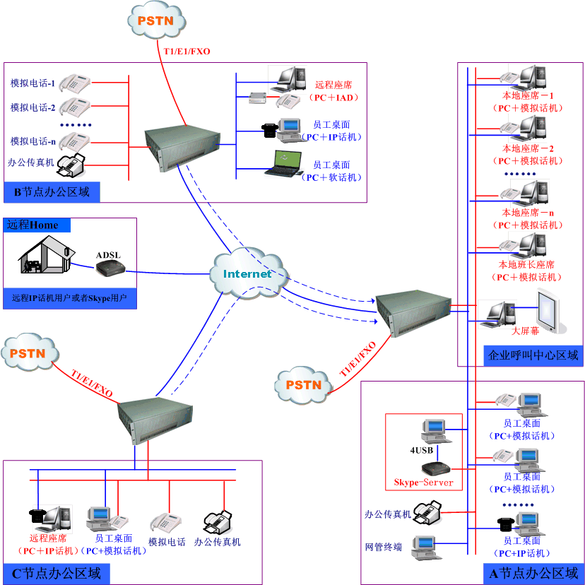 各區(qū)域內(nèi)部員工可以進(jìn)行0話費的通話和傳真外,還可以非常輕松的實現(xiàn)長途旁路功能 (即長途費用變市話費用功能);同時每部分機(jī)同時具有一個真實的當(dāng)?shù)厥性捥柎a和一個內(nèi)部分機(jī)號。
