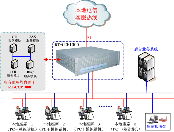 系統(tǒng)架構(gòu)簡單,CIT服務(wù)模塊、傳真服務(wù)模塊、IVR服務(wù)模塊、錄音服務(wù)模塊都內(nèi)置在RT-CCP1000內(nèi),從電信運營商接入1條數(shù)字中繼E1到RT-CCP1000,RT-CC1000提供20個人工座席10路VIR,同時支持語音、留言、傳真、短信、郵件方式,為申銀萬國客戶提供全方位的服務(wù)模式;提供業(yè)務(wù)系統(tǒng)接口與申銀萬國后臺業(yè)務(wù)系統(tǒng)無縫整合,實現(xiàn)呼叫中心系統(tǒng)與業(yè)務(wù)系統(tǒng)的緊密結(jié)合;為申銀萬國量身定制多款個性化的工單。維護界面采用全中文WEB方式,支持遠(yuǎn)程維護,同時也支持遠(yuǎn)程座席方式,為后續(xù)公司的發(fā)展打下了堅實的基礎(chǔ)。