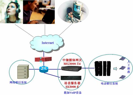 如圖,新加SIP融合通信平臺SS3000-E,完成客戶端軟電話的注冊、呼叫控制等功能;部署中繼媒體網關連接數(shù)據網絡和電話銀行系統(tǒng)的程控交換機。