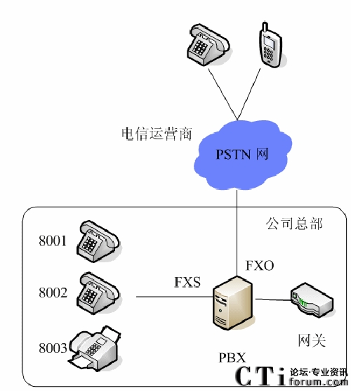 公司總部增加一臺語音網(wǎng)關,通過中繼線與原有的PBX相連,異地分公司增加一臺IPPBX,下面開通分機,公司總部和分公司通過IP網(wǎng)連接在了一起。