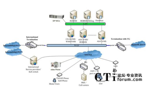 計(jì)費(fèi)系統(tǒng)將把視頻通話和普通的語音通話分開來計(jì)費(fèi),視頻會議業(yè)務(wù)也可以作為一項(xiàng)特殊業(yè)務(wù)單獨(dú)計(jì)費(fèi)。所有這些業(yè)務(wù)都使用相同的計(jì)費(fèi)和OAM系統(tǒng)。在這個(gè)運(yùn)營商級軟交換系統(tǒng)中,已經(jīng)把視頻業(yè)務(wù)完全集成進(jìn)了系統(tǒng)。下面是網(wǎng)絡(luò)示意圖:
