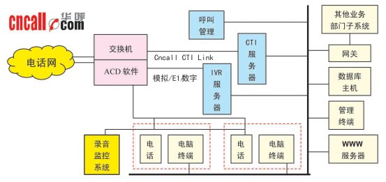 華呼(www.cncall.com)典型的基于交換機(jī)平臺(tái)廣電呼叫中心解決方案的主系統(tǒng)包括:PBX交換機(jī)平臺(tái)、計(jì)算機(jī)電話集成系統(tǒng)(CTI)、交互式語(yǔ)音應(yīng)答系統(tǒng)(IVR/IFR)、人工座席系統(tǒng)、電話錄音監(jiān)聽管理系統(tǒng)CCLog、呼叫中心管理系統(tǒng)CCM、數(shù)據(jù)庫(kù)應(yīng)用系統(tǒng)、WWW服務(wù)器、應(yīng)用網(wǎng)關(guān)。