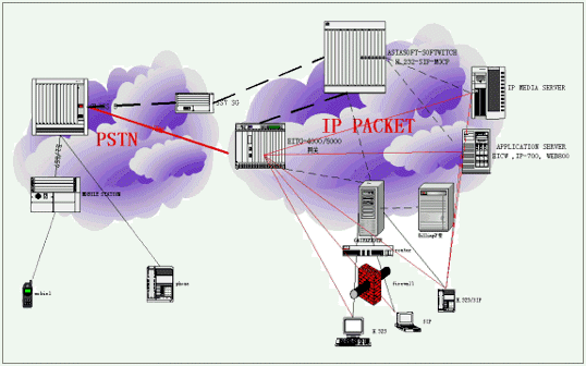 1、可以把裝有eProxy的服務(wù)器看成專用交換機VoIP switch,它負責(zé)內(nèi)外電話的接通與斷開。如圖: