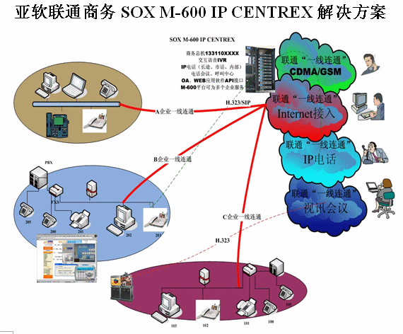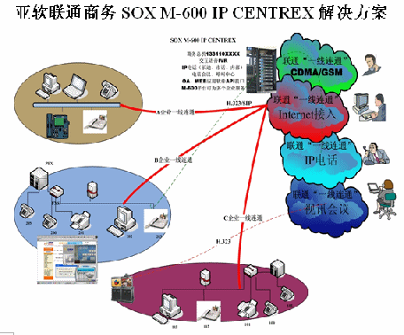 亞軟SOX融合通信解決方案也叫聯(lián)通商務(wù)解決方案,該方案是基于軟交換的可為多個集團(tuán)用戶提供IP語音解決方案。SOX融合通信解決方案為集群用戶提供了區(qū)別于傳統(tǒng)集團(tuán)內(nèi)部、外部的通信方式,集團(tuán)無需再購置PBX及為其支付維護(hù)費用。由于SOX融合通信解決方案是置于IDC托管中心并基于IP軟交換技術(shù),所以沒有地域限制,具有集群性、可移動性等IP通信特征。