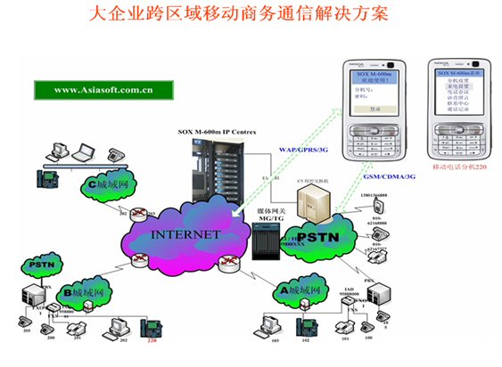 該方案為企業(yè)提供了跨地域的低成本、高效率、方便靈活的IP融合通信基本服務(wù)和增值服務(wù),使用SOX-M就不再有地域限制,宛如本地化電話分機(jī)辦公通信一樣,而且還可以享有更多的增值服務(wù):語(yǔ)音信箱、電話會(huì)議、一號(hào)通、等候音樂、語(yǔ)音菜單、呼叫篩選等等,更具特色的是提供了融合通信的新型“移動(dòng)總機(jī)”和“移動(dòng)分機(jī)”服務(wù),可以使我們手里的移動(dòng)電話(即手機(jī))完全成為辦公室分機(jī),可以在手機(jī)上完成固定分機(jī)的PBX特性功能,如在線轉(zhuǎn)接,即時(shí)會(huì)議等,通過SOX-M可以直接管理分機(jī)各種設(shè)置,如“來(lái)電管理、手機(jī)聽取語(yǔ)音留言、WAP上召開電話會(huì)議、聯(lián)系中心(CRM)WAP點(diǎn)擊呼叫”等等,實(shí)現(xiàn)了語(yǔ)音和數(shù)據(jù)融合通信給企業(yè)帶來(lái)的更多好處。