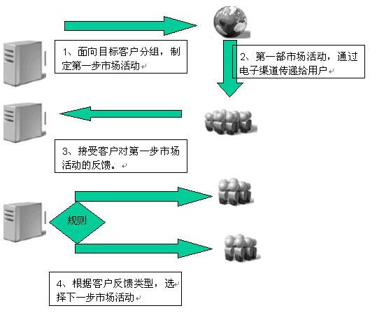電子化營(yíng)銷過(guò)程,是通常是多步驟市場(chǎng)活動(dòng)。每個(gè)步驟完成一定的工作,下一步的市場(chǎng)活動(dòng)將根據(jù)客戶對(duì)市場(chǎng)活動(dòng)的反饋和內(nèi)置的市場(chǎng)活動(dòng)的規(guī)則進(jìn)行選擇。而且每個(gè)步驟客戶市場(chǎng)活動(dòng)的反饋,都由電子化營(yíng)銷系統(tǒng)中的反饋處理系統(tǒng)集中到CRM系統(tǒng)中。從而為市場(chǎng)活動(dòng)效果評(píng)估,提供數(shù)據(jù)上的支持。