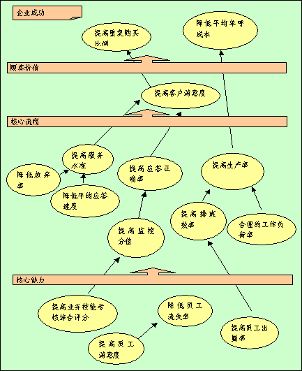 全程全網(wǎng)考核策略目標(biāo)因果關(guān)系圖是"平衡計分卡"應(yīng)用的重要環(huán)節(jié),在此要特別強調(diào)?因為它是將根據(jù)公司遠(yuǎn)景規(guī)劃以及使命確定的四個考核維度轉(zhuǎn)化為全程全網(wǎng)考核系統(tǒng)進(jìn)入實際操作階段之關(guān)鍵步驟。在平衡記分卡的設(shè)計過程中,它起著承前啟后的作用,在構(gòu)建呼叫中心全程全網(wǎng)考核系統(tǒng)中全程全網(wǎng)考核策略目標(biāo)因果關(guān)系圖的突破性銜接功能-以其邏輯性的架構(gòu)來界定和描述實現(xiàn)全面績效考核的策略方案。將公司成功、客戶價值、核心流程和呼叫中心核心能力之間的關(guān)聯(lián)清晰地呈現(xiàn),并將企業(yè)的策略與其績效衡量系統(tǒng)相銜接。
