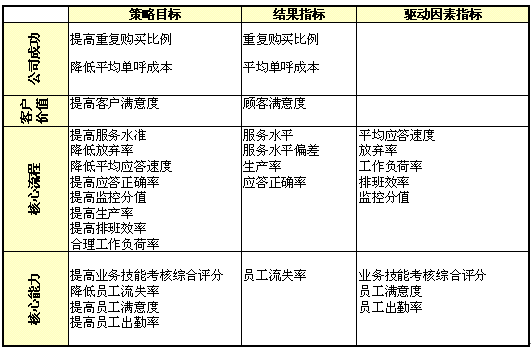 1)公司成功;2)客戶價值;3)核心流程;4)核心能力;成為呼叫中心全程全網(wǎng)考核衡量的四大維度,實際反映了呼叫中心運營管理中成本、客戶、內(nèi)部流程及呼叫中心的學(xué)習(xí)與成長的四個至關(guān)重要的領(lǐng)域,是實現(xiàn)公司遠(yuǎn)景規(guī)劃與使命的營運管理核心。