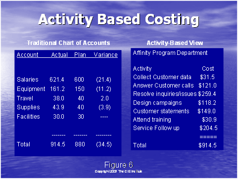 相關(guān)的是,使用傳統(tǒng)的成本和通過一種系統(tǒng)的合理的方式把該成本分配到各個行動上去。這是它們自身的科學(xué),如果你擁有數(shù)字的頭腦,你可以確定一個計劃,該計劃把企業(yè)的成本分配到圖6右手邊所示的不同的行動上去。這是一個關(guān)鍵的步驟。