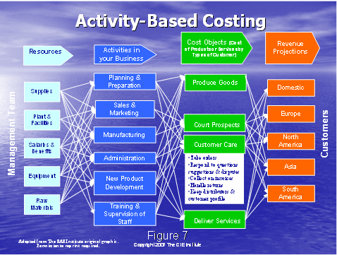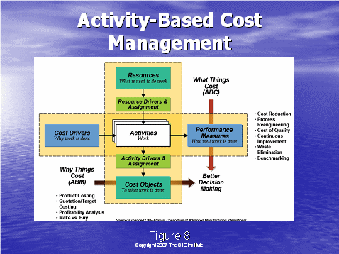 通過了解圖8,我們將以行動成本管理大體是什么的總括作為結(jié)束。我們從左邊的成本驅(qū)動因素開始——這是做工作的原因,例如:獲得客戶,維持客戶。就如圖4中所說的,這些成本驅(qū)動因素可以細(xì)分到工作行動上去。可以通過描述人,培訓(xùn),設(shè)備和技術(shù)資源來組成工作行動。資源驅(qū)動因素被用于分配這些企業(yè)成本到各個行動上去。下一步就是系統(tǒng)地確定行動驅(qū)動因素,分配行動成本到成本對象上去,這有利于決策的制定。例如,獲得一個客戶和維持一個客戶需要花費多少的成本?