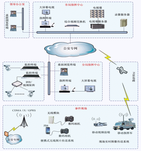 系統(tǒng)分3個(gè)層次,市局指揮中心、區(qū)縣分局(交警、消防)指揮中心、移動(dòng)指揮終端(現(xiàn)場(chǎng)指揮中心),主要設(shè)備包括:綜合視頻交換機(jī)、指揮終端、監(jiān)控終端、電視墻服務(wù)器、存儲(chǔ)錄像服務(wù)器、瀏覽終端、移動(dòng)視頻前端、搞清晰圖片傳輸系統(tǒng)等。系統(tǒng)結(jié)構(gòu)如圖示。
