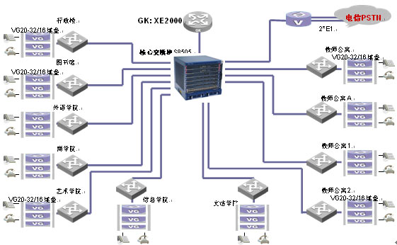 IP語(yǔ)音網(wǎng)采用華為3Com全系列語(yǔ)音視訊產(chǎn)品。為了滿(mǎn)足學(xué)校通訊的需求,華為3Com選用Quidway XE2000 IP PBX語(yǔ)音服務(wù)器作為核心呼叫控制設(shè)備,作為獨(dú)立控制的語(yǔ)音服務(wù)器,網(wǎng)絡(luò)規(guī)劃完®全自主,實(shí)現(xiàn)快速部署。采用50余臺(tái)ViewPoint®