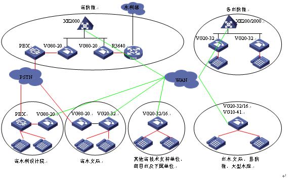 省水利設計院已經部署了200門容量的PBX,采用語音網關將PBX及其下掛的模擬電話接入系統(tǒng)后,除了不需要連接水利部語音系統(tǒng)外,其組網與省防總完全一致,與省水利設計院連接的PBX可采用VG80-20,使用2個E1連接。