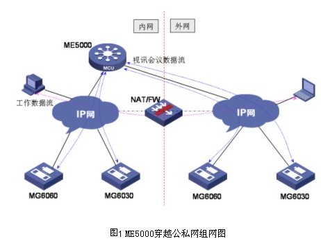 ME5000 提供4個以太網(wǎng)口,其中3個網(wǎng)口可以用來召開視訊會議,這3個網(wǎng)口可以跨越在不同的網(wǎng)段上,實現(xiàn)公、私網(wǎng)的穿越,同時也可以為用戶提供網(wǎng)絡(luò)負(fù)載均衡的功能。在存在防火墻的環(huán)境中,可以把ME5000的兩個網(wǎng)口分別布置在防火墻的兩側(cè),連接內(nèi)、外網(wǎng)的視訊終端,從而可以直接繞過防火墻進(jìn)行開會,而不影響其它數(shù)據(jù)業(yè)務(wù)的安全,內(nèi)、外網(wǎng)進(jìn)出數(shù)據(jù)業(yè)務(wù)時仍然會通過防火墻,網(wǎng)絡(luò)安全保護(hù)作用不受影響。