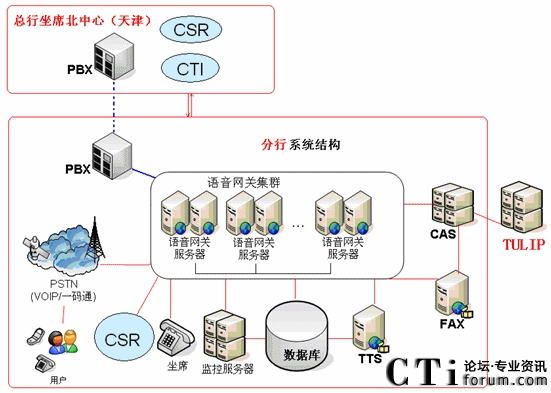 對于山東省分行連接總行呼叫中心北中心心的情況,農(nóng)業(yè)銀行對系統(tǒng)的總體結(jié)構(gòu)已經(jīng)做了比較詳細(xì)的規(guī)劃,異地坐席中心的系統(tǒng)結(jié)構(gòu)圖如下: