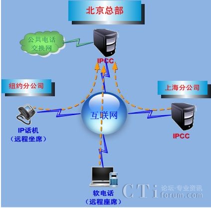 客戶采用IPCC-100型的IPCC系統(tǒng)組建一套分布式呼叫中心系統(tǒng)。它不僅實(shí)現(xiàn)呼叫中心功能,又完全取代傳統(tǒng)PBX作為核心的通信系統(tǒng)?蛻艨偛咳萘繛50門分機(jī),30門用于呼叫中心坐席,20門用于辦公線路用。另有2個(gè)分支機(jī)構(gòu)分別配置一臺(tái)IX-50和IE-62,作為分公司的電話交換設(shè)備。通過(guò)互聯(lián)網(wǎng)與總部的IPCC點(diǎn)對(duì)點(diǎn)對(duì)接,實(shí)現(xiàn)內(nèi)部互通免費(fèi)。