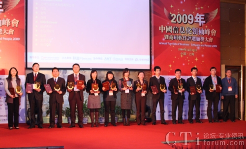 CTI論壇(ctiforum)12月15日消息(記者 張塵):12月10日,“2009中國(guó)信息化領(lǐng)袖峰會(huì)暨商用軟件評(píng)選頒獎(jiǎng)大會(huì)”在上海東錦江索菲特大酒店隆重召開。此次會(huì)議以軟件行業(yè)協(xié)會(huì)為指導(dǎo)單位,由暢享網(wǎng)主辦,AMT集團(tuán)及德賽網(wǎng)協(xié)辦,并得到上海浦東軟件園的特別支持,通過歷時(shí)三個(gè)多月的調(diào)查研究和評(píng)選,結(jié)果于當(dāng)日揭曉。CTI論壇報(bào)道