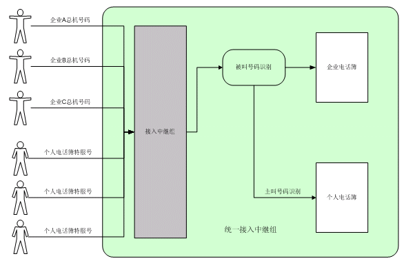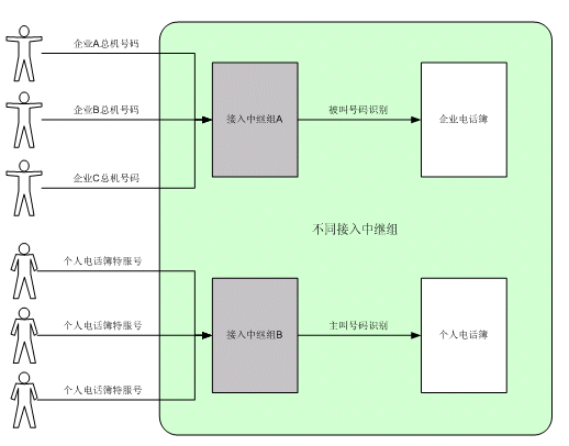 個人電話簿呼叫中,系統(tǒng)將根據(jù)主叫號碼,鑒別出主叫的身份,選擇進(jìn)入相應(yīng)的個人電話簿,提供個人電話簿服務(wù)。