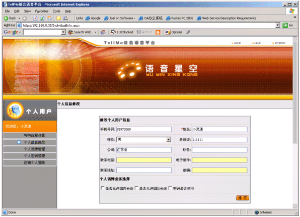 個人電話簿存放個人用戶的電話記錄信息。個人用戶通過特服接入號碼訪問自己的個人電話簿,說出需要撥打的電話名稱,進(jìn)行電話撥打。