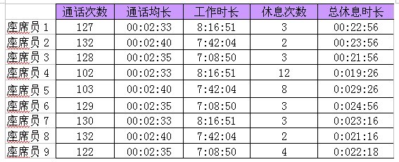筆者寫這種文章,肯定要被天下的座席員給罵死,就像是魔術(shù)師最生氣的,莫過于電視臺在電視節(jié)目里面公開他們的秘密一樣,寫文章講座席員有哪些鉆漏洞的作法,真是犯天下之眾怒,吃力不討好。 上面這張表格,畫出的就是9個(gè)座席員的話務(wù)數(shù)據(jù)情況,分別列出了通話次數(shù)、通話均長、工作時(shí)長、休息次數(shù)、總休息時(shí)長這五個(gè)KPI指標(biāo),你可以看的出來是哪一個(gè)座席員在呼攸嗎?