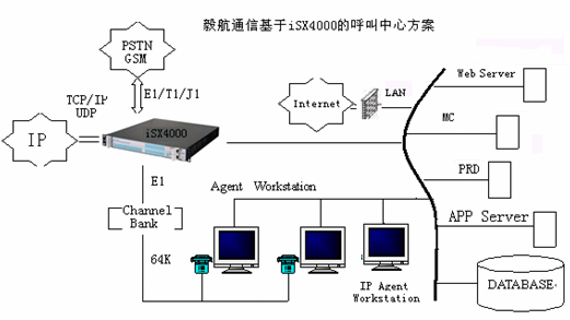 相對(duì)于現(xiàn)在的兩種主流呼叫中心方案,毅航通信基于iSX4000呼叫中心解決方案直接整合了Internet的接入。傳統(tǒng)由IVR完成的操作也可以通過Web頁(yè)面上的流程實(shí)現(xiàn),這樣用戶通過下拉菜單、簡(jiǎn)單填寫、點(diǎn)擊按鈕等操作完成客戶識(shí)別、業(yè)務(wù)識(shí)別等操作,這些流程完成后,通過VoIP對(duì)呼叫中心呼入,由呼叫中心對(duì)呼入進(jìn)行受理,再按照相應(yīng)的原則分配到座席,座席再作相應(yīng)的應(yīng)答和處理,從而為客戶提供了一個(gè)通過Web站點(diǎn)直接進(jìn)入呼叫中心的途徑,把Internet所具有的豐富信息資源和強(qiáng)大的功能賦予呼叫中心,它向客戶提供一個(gè)可訪問的Web站點(diǎn),使得呼叫中心從“撥叫到交談(Dial to Talk)”發(fā)展到“點(diǎn)擊到交談(Click to Talk)”,通過Internet可以提供IP電話語音呼叫、Call Back、IP傳真、IM、E-mail等功能,擴(kuò)展了通信渠道,一方面用戶可以實(shí)現(xiàn)免費(fèi)接入到呼叫中心,另一方面企業(yè)能夠向更多的客戶提供優(yōu)質(zhì)、方便的服務(wù)資源,而且由于這些資源的價(jià)格相對(duì)傳統(tǒng)通信便宜,使企業(yè)為客戶提供全國(guó)、乃至于全球服務(wù)成為可能,提高了企業(yè)客戶服務(wù)水平,增強(qiáng)了企業(yè)競(jìng)爭(zhēng)力。毅航通信統(tǒng)一呼叫中心解決方案系統(tǒng)結(jié)構(gòu)如圖所示:
