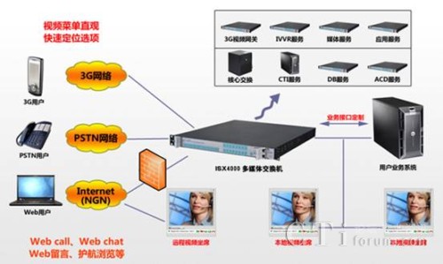 基于毅航通信ISX4000多媒體交換機的IVVR或視頻呼叫中心系統(tǒng)平臺可同時支持3G網(wǎng)絡、2G以及Internet網(wǎng)絡的接入;支持視頻、語音、傳真、郵件、短信等全方位服務模式;支持集中和IP分布式部署,座席數(shù)隨時隨地任意伸縮,可輕松形成一個跨區(qū)域、集語音和視頻于一體、統(tǒng)一的視頻呼叫中心系統(tǒng)。