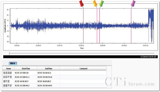 關(guān)鍵詞組字符串設(shè)定,可透過系統(tǒng)調(diào)配建置學(xué)習(xí)性的語料庫,當(dāng)收集可比對的關(guān)鍵詞錄音數(shù)量具規(guī)模時,可達到一定的辨識度信心水平,同時透過Web錄音調(diào)閱畫面,在撥放符合關(guān)鍵詞音檔時,可提供標(biāo)示、注記、搜尋功能及音文件波形呈現(xiàn)關(guān)鍵詞的落點以及情緒分析變化,有效管理呼叫中心的關(guān)鍵議題,降低客訴率,提升客戶滿意及服務(wù)水平。