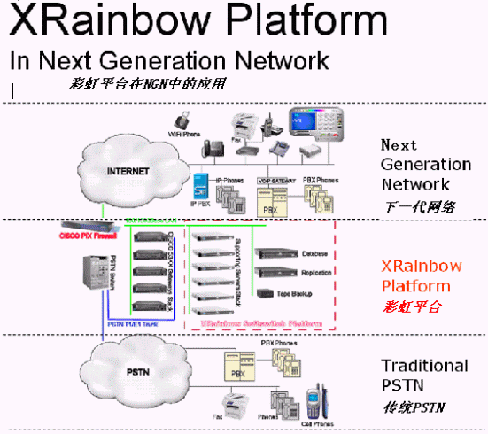 Xrainbow軟交換平臺它是基于SIP協(xié)議、針對中國現(xiàn)有Internet網(wǎng)絡(luò)狀況和現(xiàn)有網(wǎng)路硬件服務(wù)商的VoIP 設(shè)備的特點(diǎn),為電信運(yùn)營商和二級/虛擬運(yùn)營商, 通信系統(tǒng)集成商提供運(yùn)營于下一代新網(wǎng)絡(luò)(NGN, Next Generation Network)之上的一套集VoIP 語音及信號交換、管理及服務(wù)于一體的電信級系統(tǒng)平臺。X彩虹SIP軟交換系統(tǒng)包括以下的核心服務(wù)器如下認(rèn)證服務(wù)器、路由服務(wù)器、配置服務(wù)器、功能服務(wù)器、語音郵件服務(wù)器、媒體轉(zhuǎn)發(fā)服務(wù)器和網(wǎng)絡(luò)管理服務(wù)器。我們的系統(tǒng)可以實(shí)現(xiàn)多種功能,功能模塊包括:監(jiān)控模塊、計(jì)費(fèi)模塊、管理模塊、話吧模塊、代理商模塊、軟電話模塊、集團(tuán)功能模塊、電話卡模塊、主叫認(rèn)證模塊、回?fù)苣K、批發(fā)計(jì)費(fèi)模塊、電話會議模塊等。