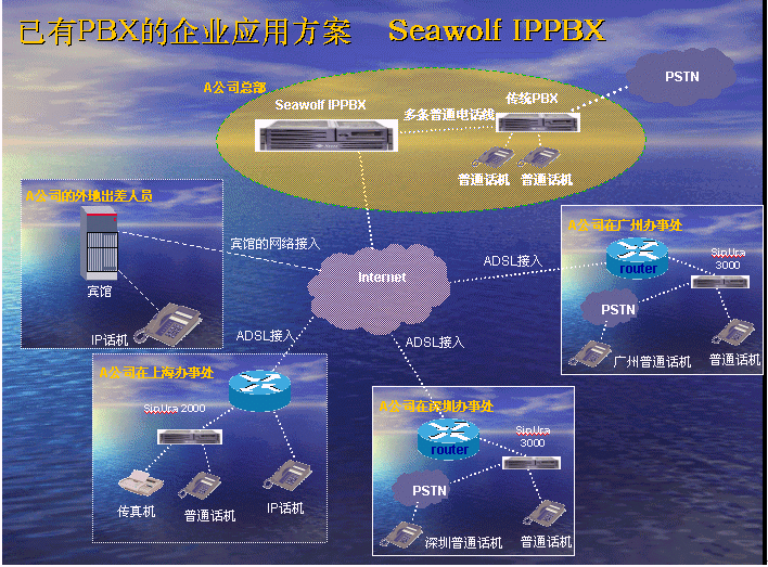 北京海狼網(wǎng)絡(luò)通信有限公司推出的Seawolf IPPBX解決方案切實(shí)從集團(tuán)企業(yè)的利益出發(fā),為客戶成功地降低了通訊成本。Seawolf IPPBX是一款功能強(qiáng)大的小型語(yǔ)音交換平臺(tái)設(shè)備。它將傳統(tǒng)的交換機(jī)技術(shù)與VOIP的先進(jìn)技術(shù)完美融合,提出了VOIP的企業(yè)級(jí)解決方案。此方案能大大縮減各大、中、小型企事業(yè)單位的通信費(fèi)用,同時(shí)增加員工的工作效率。隨著產(chǎn)品的不斷普及,Seawolf IPPBX將成為企業(yè)辦公不可缺少的一部分。此方案適合于已經(jīng)有PBX的公司,由于先期已經(jīng)投入了PBX設(shè)備,費(fèi)用昂貴,所以不會(huì)輕易被替換。在外地有多家分公司,使用傳統(tǒng)電話通訊費(fèi)用很高,希望能降低成本。并希望在分公司所在城市可以通過(guò)當(dāng)?shù)氐腜STN落地,節(jié)省長(zhǎng)途費(fèi)用。依照客戶的需求,我們制定了以下方案:海狼科技公司供稿 CTI論壇編輯
