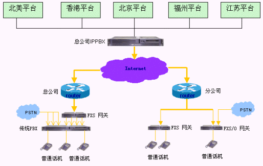 - 建設企業(yè)內(nèi)部的IP電話系統(tǒng),實現(xiàn)企業(yè)內(nèi)部各個分支結構之間的免費通話,即總公司之間、各個分支機構之間、總公司與各個分支機構之間通訊免費。由于各地電話環(huán)境不同,各個分支機構在使用內(nèi)部通話功能時候操作有些差異。