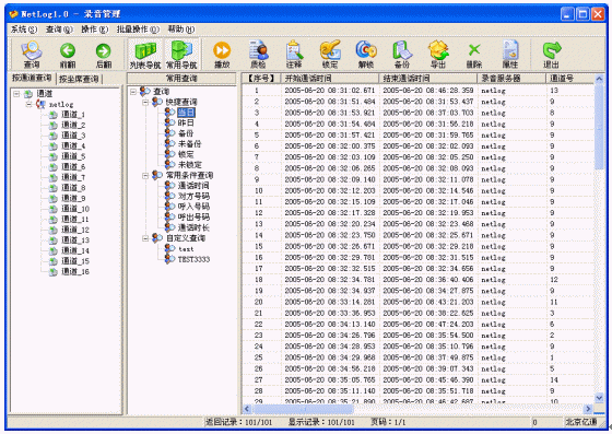 主要是對錄音進行管理,分為錄音查詢和錄音操作兩大部分。錄音查詢除了提供常規(guī)的按條件組合查詢外,還提供了人性化的常用查詢,系統(tǒng)已經內置了很多常用查詢,例如:當日查詢,您只要直接選擇當日查詢,就可以馬上開始查詢當日的所有錄音,減少您每次輸入查詢條件的工作量,并且還可以靈活的自定義常用查詢,充分滿足您的查詢要求。錄音操作提供了方便快捷的操作方式。批量數據的處理能力可以讓用戶以最快的速度從煩瑣的工作中解脫出來。詳細的記錄信息可以滿足所有用戶的要求,特定信息的加入可以滿足特殊行業(yè)的使用,如呼叫中心行業(yè)、服務臺、傳呼臺等。