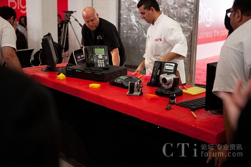 這個(gè)多層蛋糕在Avaya五月舉行的中小企業(yè)“大思維”市場(chǎng)活動(dòng)中登場(chǎng)亮相,它在一張可食用的長(zhǎng)會(huì)議桌上逼真呈現(xiàn)了工作中的Avaya電話(huà)、視頻會(huì)議解決方案和一套IP Office控制單元。 造型巧克力、谷類(lèi)食品、軟糖及其它烘焙材料同各種必要的Avaya通信組件結(jié)合在一起制作出的這個(gè)蛋糕被Buddy命名為“科技蛋糕”。 在完成由巧克力仿制電話(huà)所撥打的語(yǔ)音通話(huà)、并成功支持Buddy和Avaya高級(jí)副總裁兼全球通信解決方案總裁Alan Baratz博士之間的實(shí)時(shí)視頻會(huì)議之后,這個(gè)蛋糕作為甜點(diǎn)供全體活動(dòng)參加者享用。