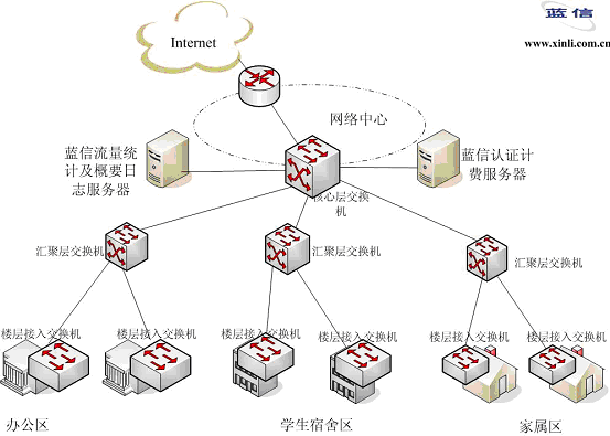 在網(wǎng)絡中心機房部署“藍信認證計費系統(tǒng)”,藍信認證計費系統(tǒng)除支持標準的RADIUS協(xié)議外,還支持領(lǐng)先的802.1x協(xié)議,通過與各接入層交換機的配合,實現(xiàn)了認證管理功能。通過綁定帳號、IP、MAC地址等15元素,真正保證只有合法用戶才能通過認證;對用戶進行分級權(quán)限管理,可按信用度等級對用戶進行劃分,方便了用戶的管理。此外,在網(wǎng)絡出口處部署藍信流量統(tǒng)計工具,通過與藍信認證計費系統(tǒng)的配合,實現(xiàn)對用戶按流量來計費,可以把用戶訪問流量按校內(nèi)校外、國內(nèi)國際來區(qū)別對待,并設置不同的費率。同時,還部署了藍信概要日志系統(tǒng),有效記錄了用戶的上網(wǎng)信息,并提供人性化的web客戶端,方便管理者進行事后查詢,有效的控制了網(wǎng)絡的安全性。