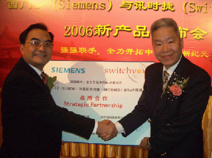 2006年3月29日的北京,還有些春風料峭,但北京長富宮的芙蓉廳卻是暖意融融,德國通訊業(yè)巨擘西門子(Siemens)和美國企業(yè)通訊業(yè)新寵訊時捷(Switchvox)聯(lián)合舉辦VoIP新產品發(fā)布會,西門子終端通訊設備(上海)有限公司CEO