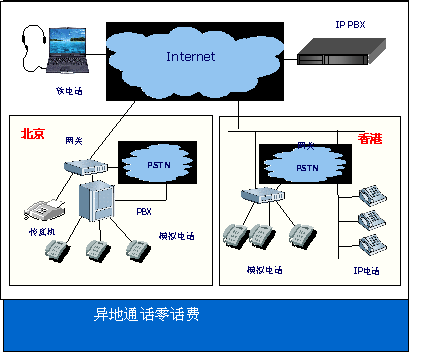 如圖所示,在整個(gè)系統(tǒng)中加入“訊時(shí)捷™ IPX”系統(tǒng)平臺(tái)設(shè)備后,各點(diǎn)之間話費(fèi)為零。