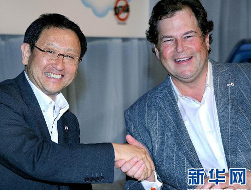 5月23日,日本豐田汽車(chē)公司總裁豐田章男(左)和美國(guó)Salesforce.com網(wǎng)站首席執(zhí)行官馬克・貝尼奧夫在東京共同出席新聞發(fā)布會(huì)。