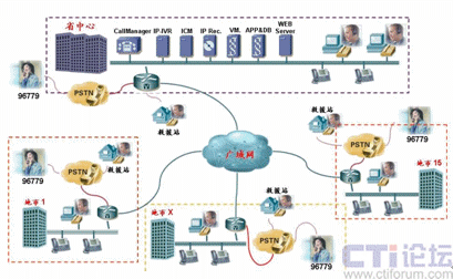如上圖所示,由于Cisco IPCC是基于標(biāo)準(zhǔn)IP網(wǎng)絡(luò)的純IP呼叫中心解決方案,呼叫中心的核心設(shè)備都只部署在省中心機(jī)房,其它地市只需要在原有網(wǎng)絡(luò)的路由器上添加語(yǔ)音模塊即可實(shí)現(xiàn)PSTN語(yǔ)音的本地接入,而無(wú)需再各地市購(gòu)買額外的接入設(shè)備。而同樣由于IP網(wǎng)絡(luò)的特性,呼叫中心的坐席可以根據(jù)需要部署在甘肅省運(yùn)輸管理局IP網(wǎng)絡(luò)可達(dá)的任何一個(gè)地方,各地市的坐席只需要配備IP電話和座席PC即可。來(lái)自PSTN的電話根據(jù)用戶在IVR中的選擇和其它路由策略,自動(dòng)分配到最適合的坐席處理,譬如來(lái)自白銀的運(yùn)政投訴由白銀市本地的運(yùn)政大廳座席人員處理。