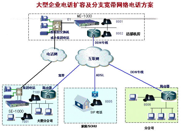 部署一臺Simplicity™ SE-1000,與原PBX連接,并通過IP網(wǎng)絡與總部的Simplicity™